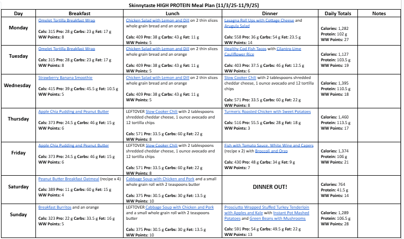 A free, 7-day high protein diet meal plan including breakfast, lunch and dinner ideas and a shopping list. All recipes include macros and Weight Watchers points.