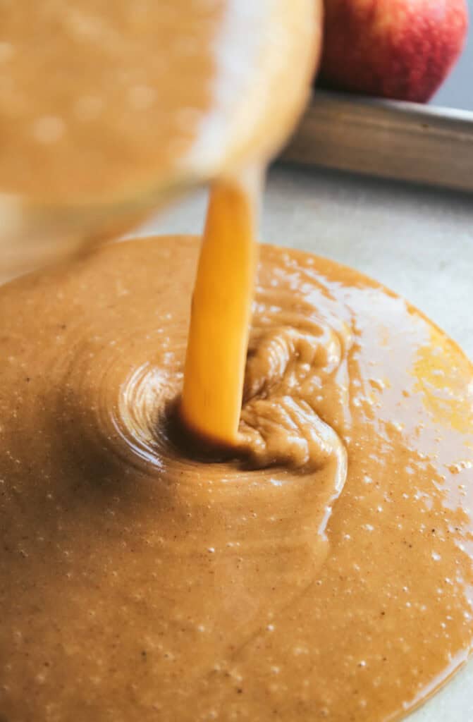 Pour the batter into your greased half sheet pan and spread it out evenly with an offset spatula (or the back of a spoon, no judgment). It should look smooth and golden, ready for its apple topping.