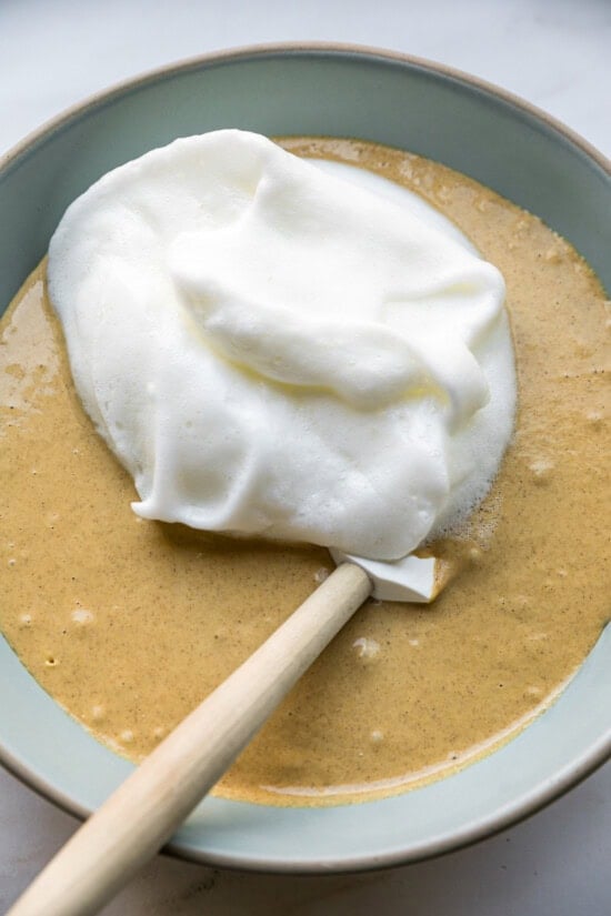 Beat the egg whites to soft peaks in another medium bowl. Then fold into the batter.