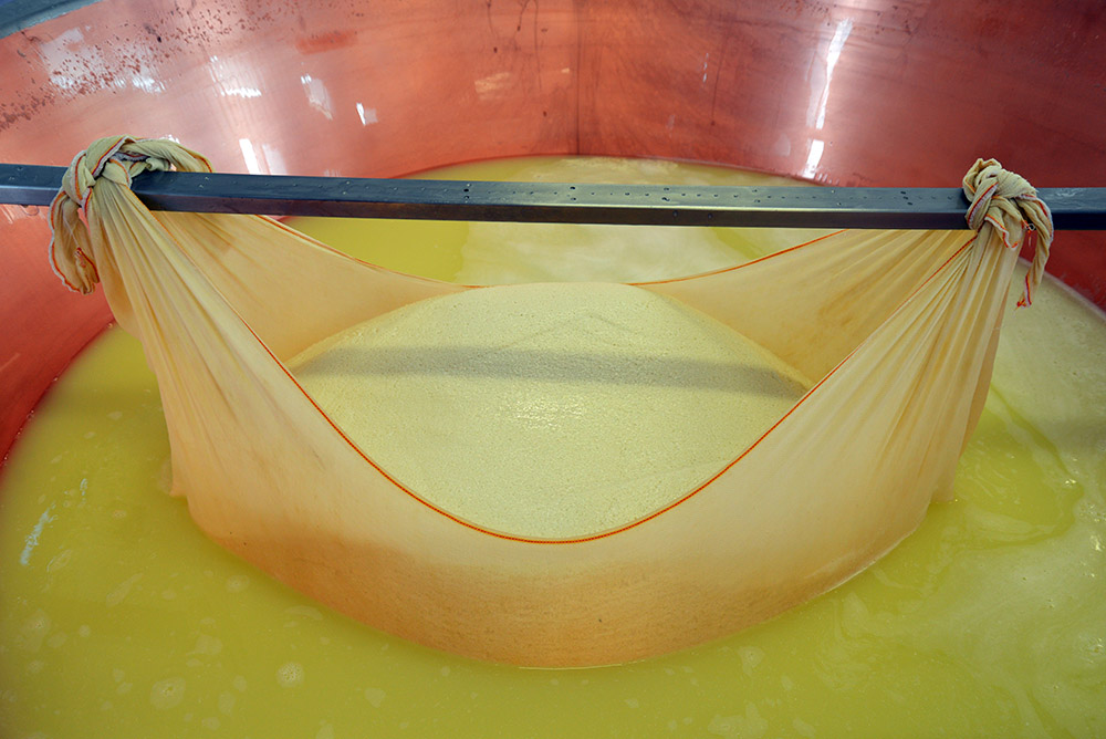 Cheese’s fabulousness all begins with a particular protein: casein. Kantha Shelke, food scientist and head of the company Corvus Blue, a food science and research firm, told Gastropod that “we’ve got a few wonder proteins in nature, and casein is definitely one of them.” One particular type of casein has special little tails that hold onto water, which is the glue that stops milk from splitting and makes it a liquid. But if you add the enzyme chymosin to milk, it cuts the tails off those casein molecules, allowing the protein to all clump together in curds. This is the beginning of milk’s journey to become cheese, a process we saw in person at the Istituto Lazzaro Spallanzani, an agricultural and cheese-making school near Bologna in Italy.